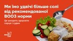 Українці щодня споживають удвічі більше солі, ніж рекомендує Всесвітня організація охорони здоров’я: у середньому — 12,6 г замість 5 г. І 75% солі за добу ми отримуємо з магазинних продуктів. Надлишок солі серйозно шкодить здоров’ю: підвищує артеріальний тиск і збільшує ризик інфаркту та інсульту.